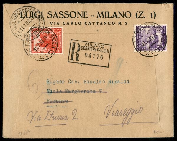Raccomandata con Impero 75 cent + aerea 1 lira (444 + Aerea 113) da Milano 31.7.39 a Viareggio