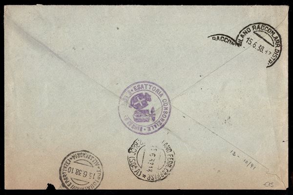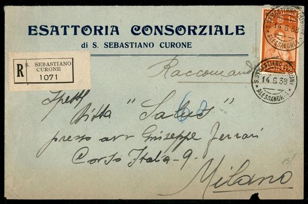 Raccomandata con Spontini 1,75 lire (433) isolato da S. Sebastiano Curone 14.6.38 a Milano