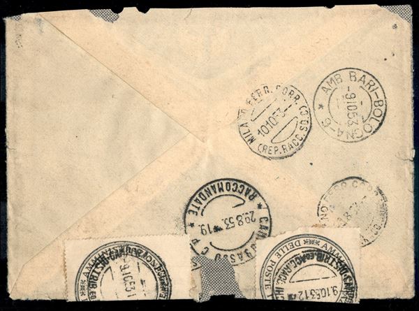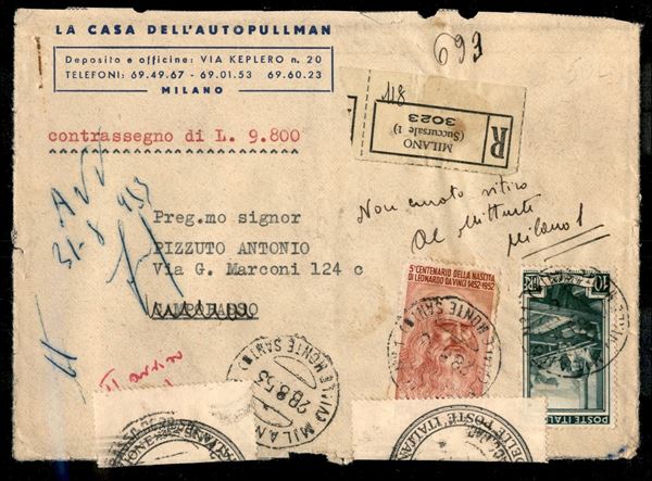 Raccomandata contrassegno Lire 9800 con 80 lire Leonardo + 10 lire Italia al Lavoro (639 + 688) - da Milano per Campobasso del 28.8.53 - busta lacerata e chiusa con sigilli delle poste rispedita al mittente