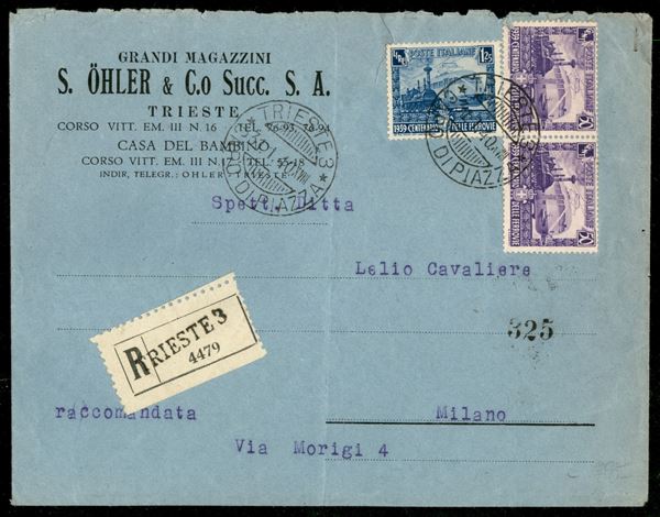 Raccomandata due porti da Trieste 3 Capo di Piazza 31.1.40 per Milano con Ferrovie coppia 50 cent + 1,25 lire (450/51)