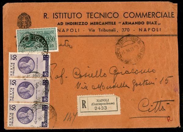 Raccomandata espresso per cittą da Napoli 25.10.36 con Orazio striscia di tre 50 cent + Espresso 1,25 lire (401 + Espressi 15)