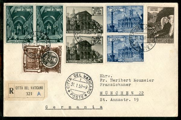 Raccomandata per la Germania del 31.1.59 per la Germania con bella affrancatura tre emissioni (125 x 2 + 127 x 2 + 130 x 2 + 163 + 237) - fresca