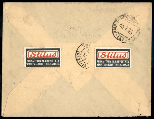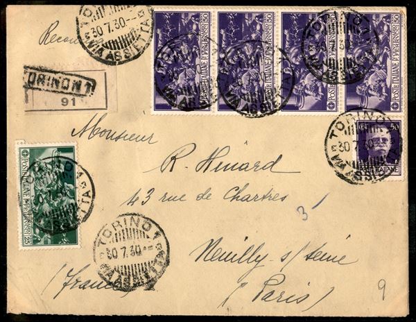 Raccomandata per Parigi affrancata 50 cent + striscia di quattro 50 cent + 25 cent (251 + 277 + 278) - da Torino Via Assietta 30.7.30 - al verso due chiudibusta Penna Stilus