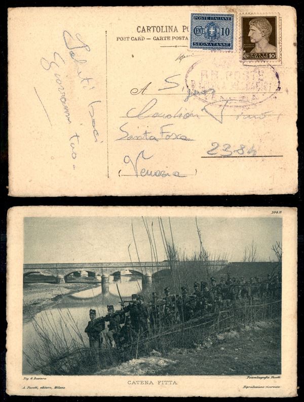 RR Poste R Scuola Meccanici Venezia (in viola) - 10 cent Segnatasse (35) + 10 cent Imperiale (245) in uso misto su cartolina per cittą