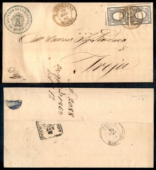 S. Severino Marche (P.ti 4) - coppia verticale del 1 cent (19 - Sardegna) - su piego per Treja del 19.11.63