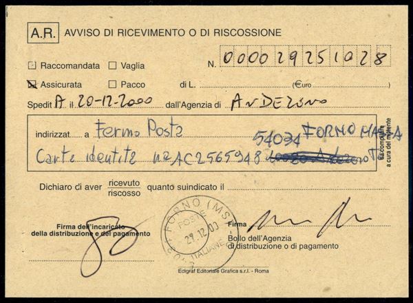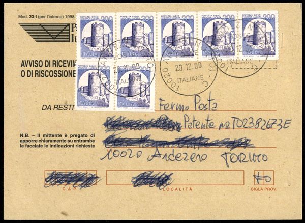 Sette valori del 200 lire Castelli Macchinette (1530A) su ricevuta di ritorno con annullo Andezeno 20.12.00