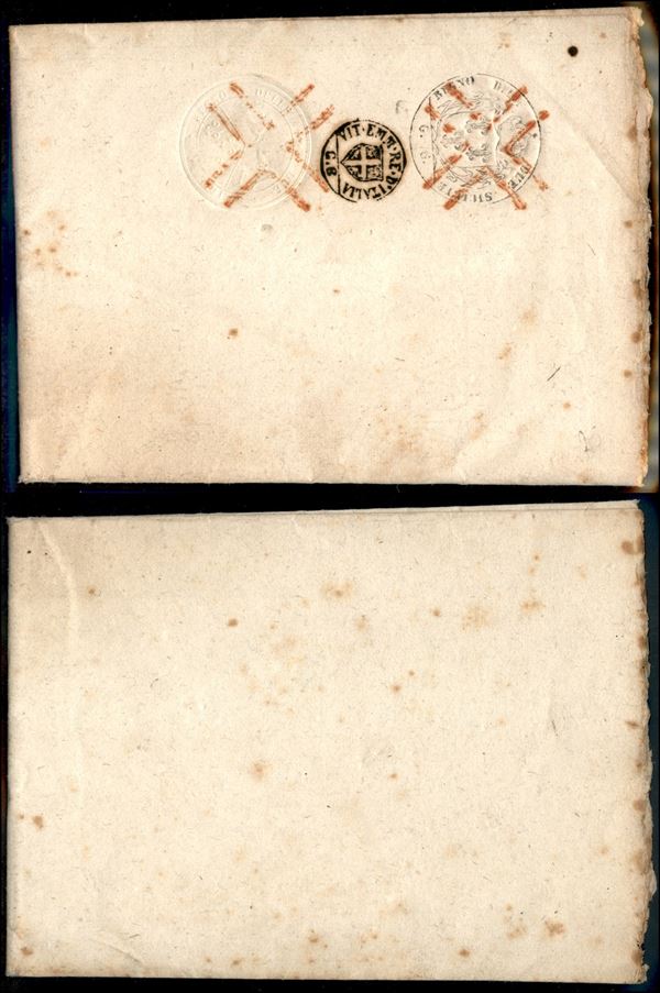 Sicilia (1861) - carta bollata da 6 grana annullata in rosso e soprastampata per 6 cent (Vit. Emm. Re d'Italia) nuova in foglio doppio