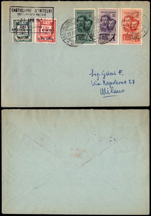 Soprastampati (18/19) + Bandiera (512/514 - RSI) su busta per Milano del 23.4.45