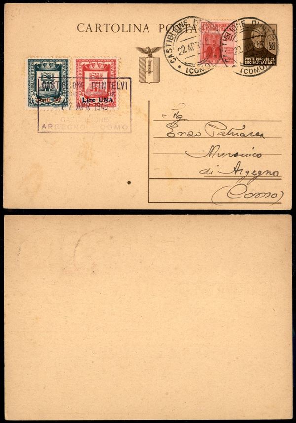 Soprastampati (18/19) + complementare (504) su cartolina postale Mazzini (112) per Argegno del 22.4.45