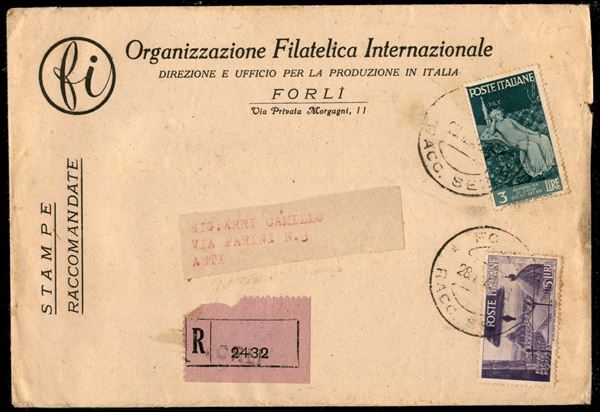 Stampe raccomandate da Forlė per Asti del 28.1.47 con 3 lire + 5 lire Repubbliche Marinare (568 + 570) - non comune