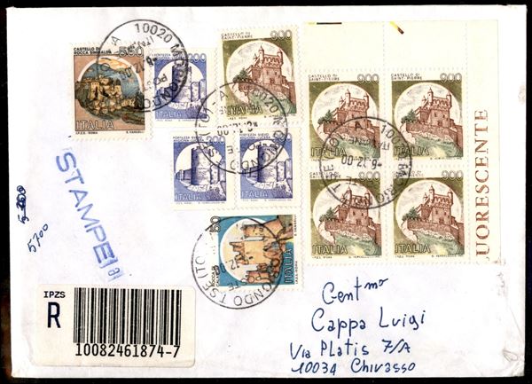 Stampe raccomandate da Moriondo per Chivasso del 6.12.00 con quartina + singolo del 900 lire + lire 550 + lire 50 Castelli + tre 200 lire Castelli Macchinette
