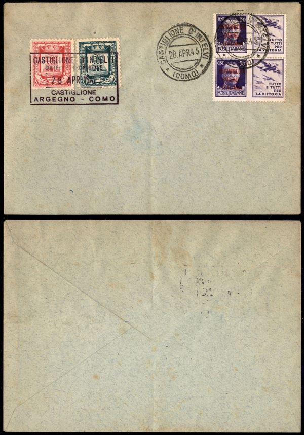 Stemma (14/15) + coppia del 50 cent Aviazione (35 Propaganda - RSI) usati su busta il 28.4.45