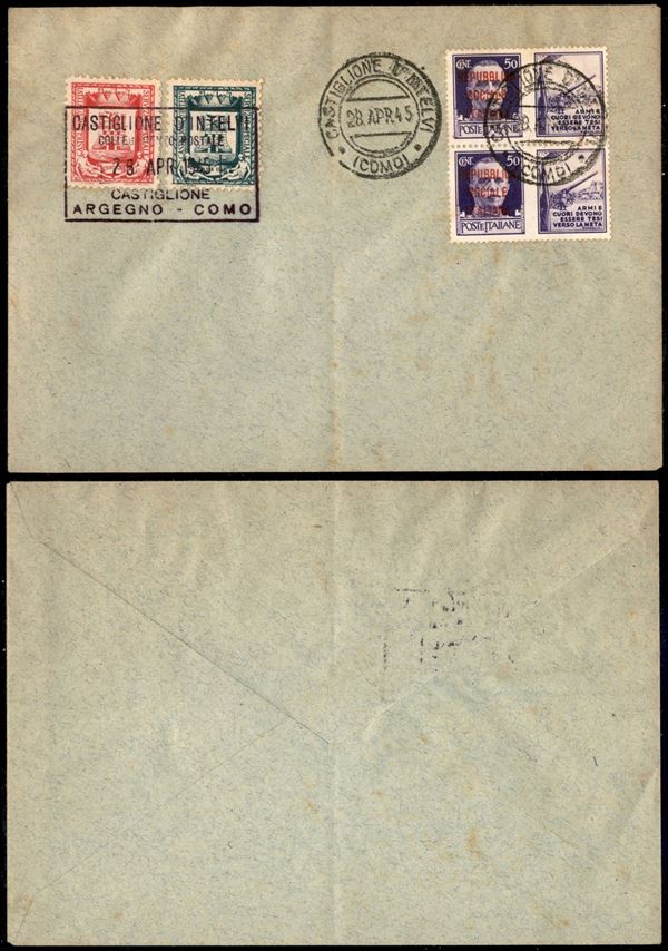 Stemma (14/15) + coppia del 50 cent Esercito (34 Propaganda - RSI) usati su busta il 28.4.45