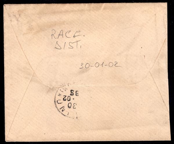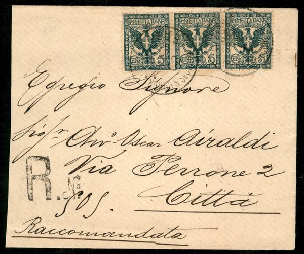 Striscia orizzontale di 3 del 5 cent Stemma (70) su bustina raccomandata da Milano per cittą 30.1.02