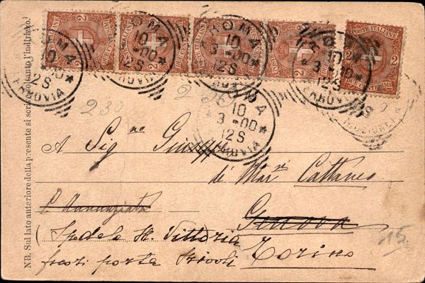 Striscia verticale di 4 del 2 cent Stemma (66) + singolo 2 cent Stemma(66a - rosso bruno) su cartolina da Roma a Genova 10.3.00 rispedita a Torino