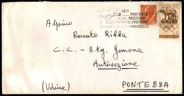 Tariffa ridotta a militare - 5 lire Olimpiadi + 10 lire Siracusana (885) su lettera da Torino a Pontebba del 28.11.60