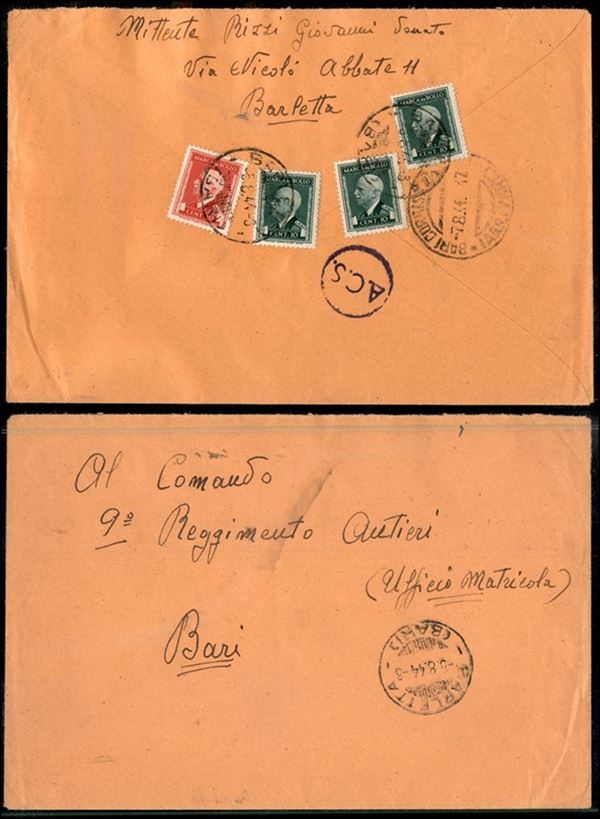 Tre 10 cent (21) + 20 cent (22) al retro di busta da Barletta a Bari del 5.8.44