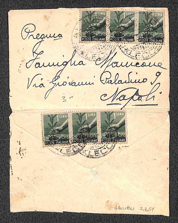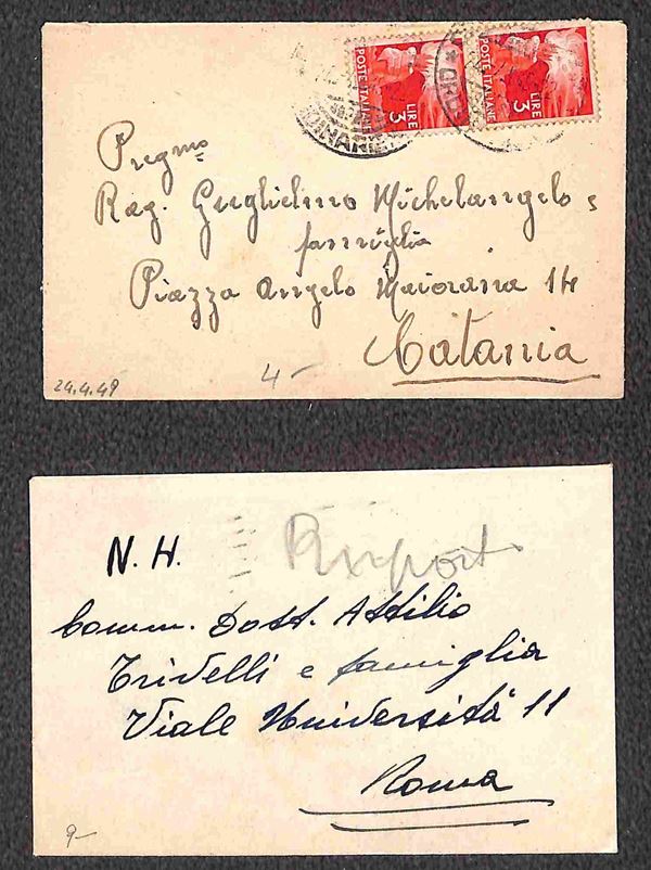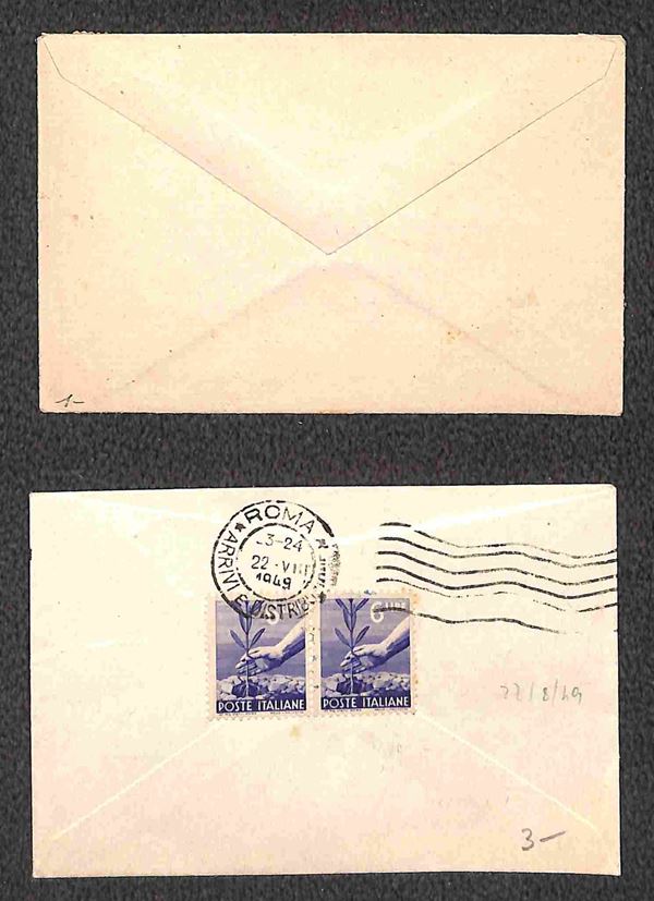 Tre bustine biglietto da visita affrancate con valori Democratica (tre 1 lire - coppia 3 lire - coppia 6 lire)