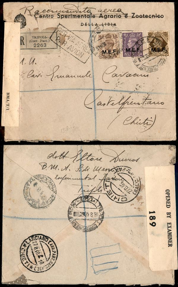 Tre valori (9 + 10 + 13) su aerogramma raccomandato da Tripoli a Chieti del 16.8.46