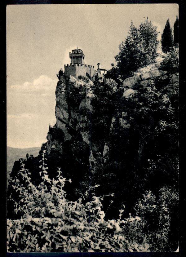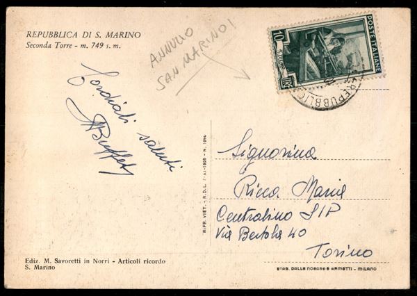 Uso di francobolli della Repubblica a San Marino - 10 lire Italia al Lavoro (639) su cartolina per Torino annullo Repubblica di San Marino 10.9.1952