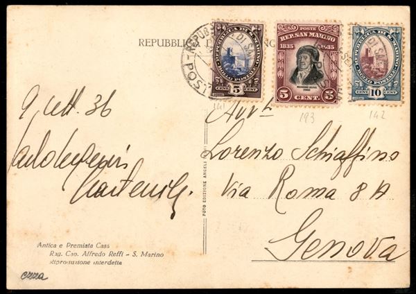 Valori gemelli - 5 cent Delfico (193) + 5 cent + 10 cent Vedute (141/142) su cartolina per Genova del 9 settembre 1936