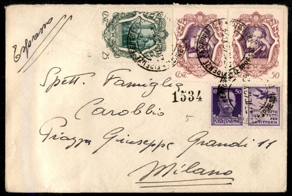 Valori gemelli - 50 cent Propaganda di Guerra (11) + due 50 cent + 25 cent Galilei (463/464) su lettera da Firenze per Milano del 27.10.42