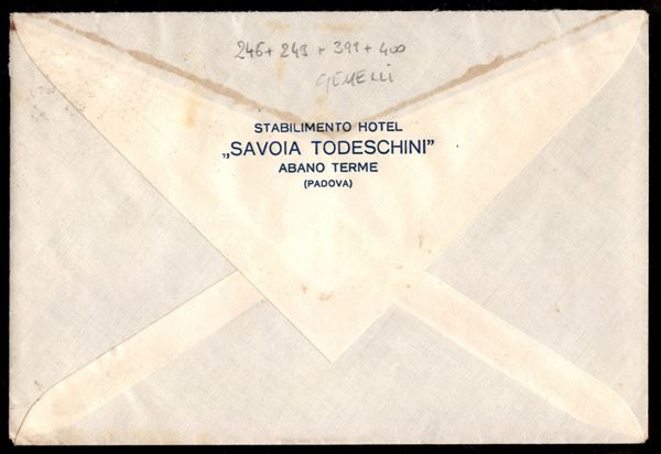 Valori gemelli da 30 cent su lettera da Abano Terme 24.9.36 per la Germania affrancata con Imperiale due 15 cent + 30 cent + Orazio coppia 20 cent + 30 cent - fresca