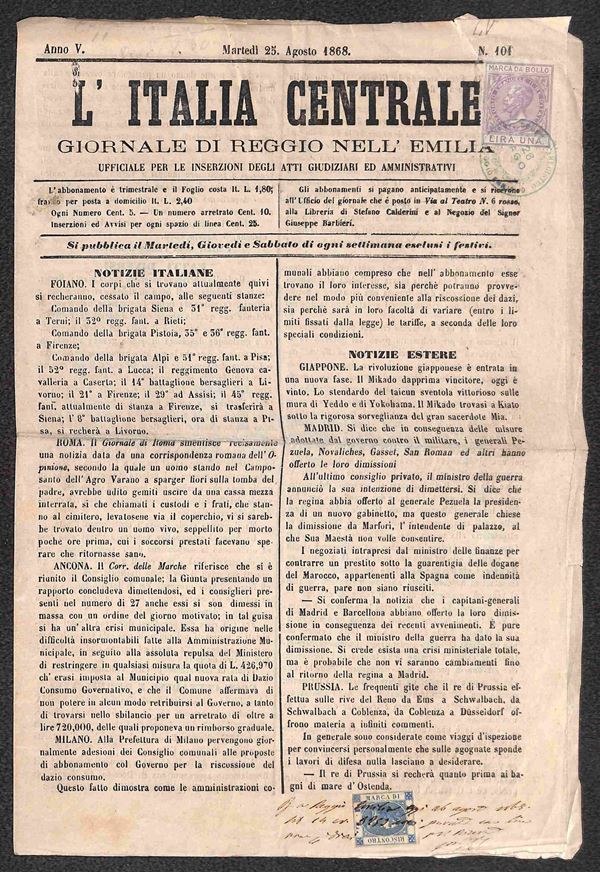 1868 - 1 lira (10) + 1 lira Riscontro (2) - intero giornale L'Italia Centrale
