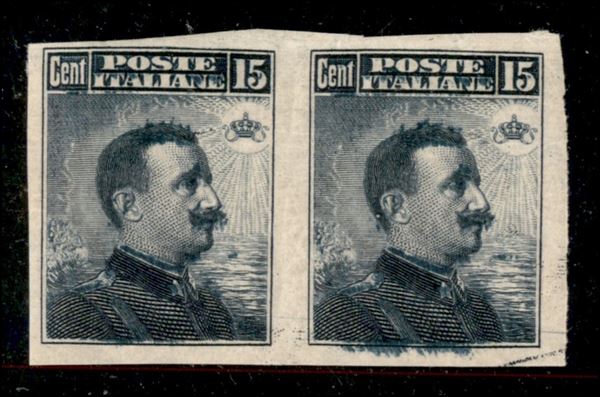 1911 - 15 cent Michetti (96e) - coppia orizzontale non dentellata con macchie di colore - gomma originale sul pezzo di sinistra integra su quello di destra