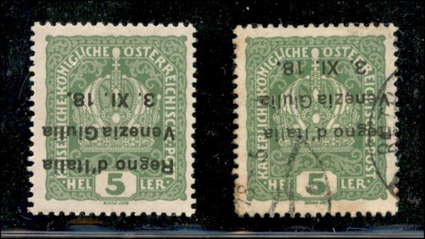 1918 - 5 heller (2a) con soprastampa capovolta - due esemplari - gomma integra/usato