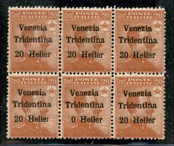 1918 - Blocco di sei del 20 heller su 20 cent (30 + 30c + 30da) senza e e Hellei - gomma integra