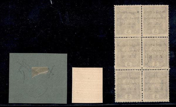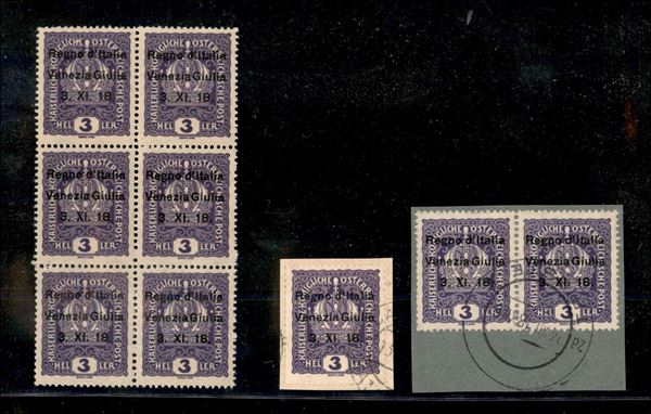 1918 - Blocco di sei nuovo + coppia e singolo su frammento del 3 heller (1i) con x di carattere diverso - gomma integra/usato