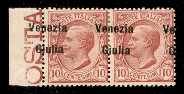 1918 - Coppia 10 cent Leoni (22cb) con soprastampa obliqua a cavallo - bordo foglio - gomma originale