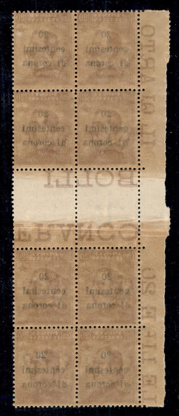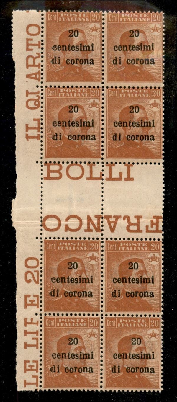 1919 - 20 cent su 20 (5) - blocco verticale di 8 con interspazio e bordo di foglio - gomma integra