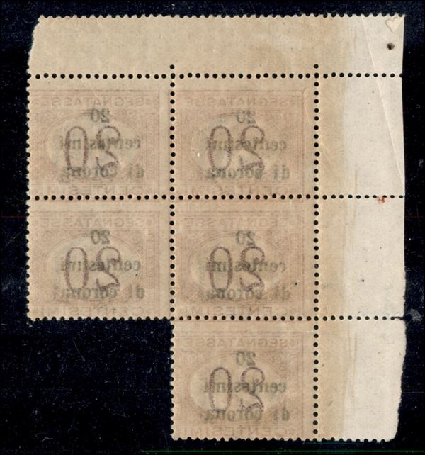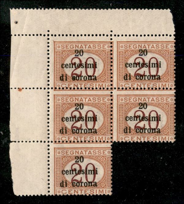 1919 - Blocco di cinque del 20 cent su 20 cent (3) - angolo di foglio - gomma integra