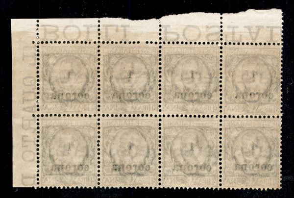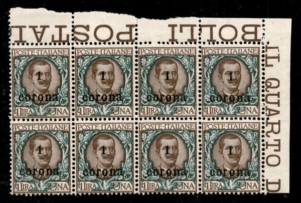 1919 - Blocco di otto del 1 corona su 1 lira (11) angolo di foglio - gomma integra