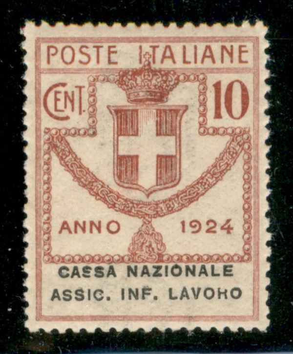 1924 - 10 cent Cassa Nazionale Assic. Inf. Lavoro (18 - varietà) - R rotta - gomma integra - ottimamente centrato