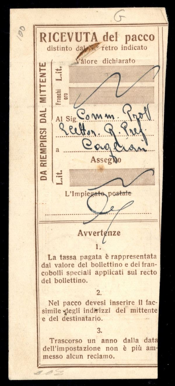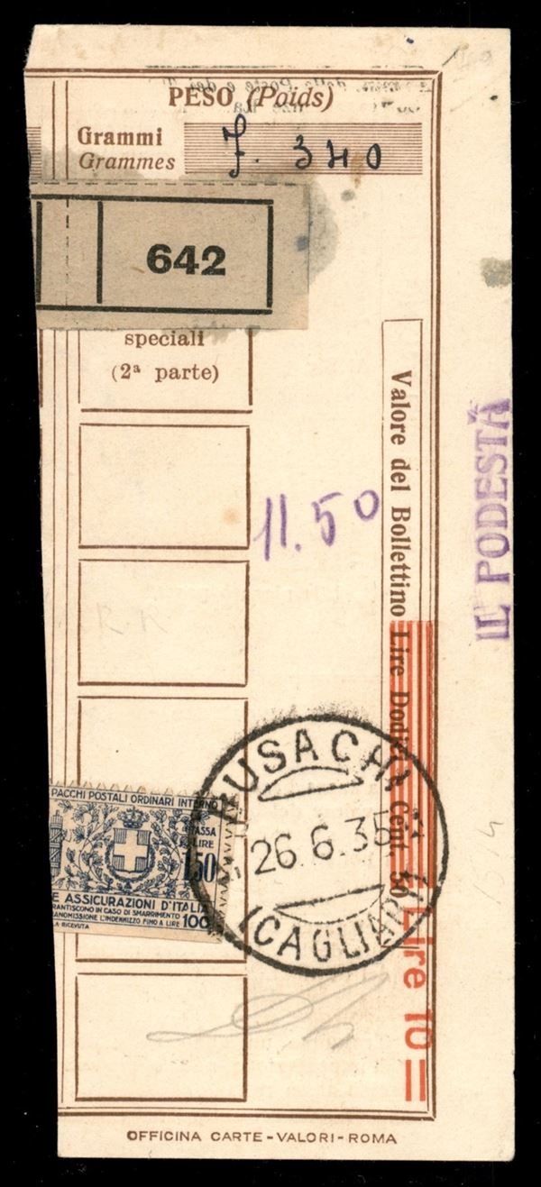1926 - 1,50 lire Assicurazioni (9) - parte di destra ritagliata con le forbici - usato su ricevuta Busachi 26.6.35