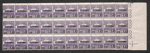 1927 - 1,85 lire su 60 cent Espresso (129 varietà) - blocco di 30 bordo foglio con soprastampe disallineate - gomma integra - non catalogato
