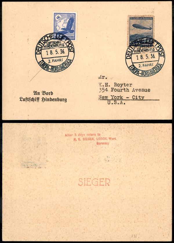 1936 (18 maggio) - Zeppelin - 2 Farth Europa Nord Amerika - cartoncino An Bord Luftschiff Hindenburg (531 + 606)