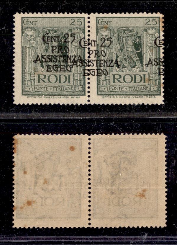 1943 - 25 cent Pro Assistenza (121 + 121fe) - coppia con soprastampe disallineate + soprastampa destra a cavallo (ASS sul pezzo di sinistra) - gomma integra - piega orizzontale e punti gialli