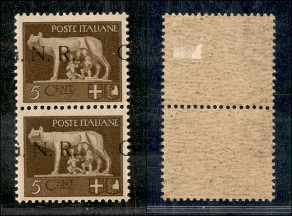1943 - 5 cent (470/Ifc) - G a cavallo - coppia verticale - gomma integra in basso