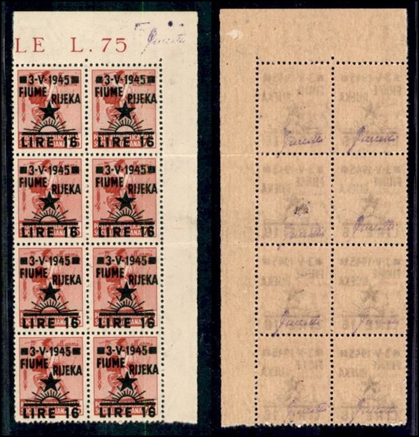 1945 - 16 lire su 75 cent (19) - filigrana capovolta - blocco angolare di 8 - gomma integra (falla di gomma su un pezzo) - timbrino di garanzia