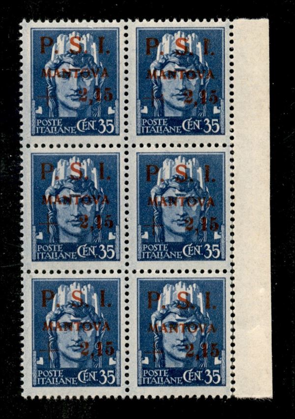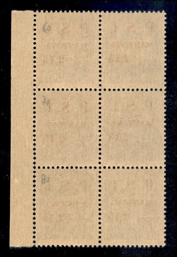 1945 - 35 cent + 2,15 lire (3) - blocco di 6 (posiz. 49/70) con soprastampa slittata nel pezzo superiore destro - gomma integra