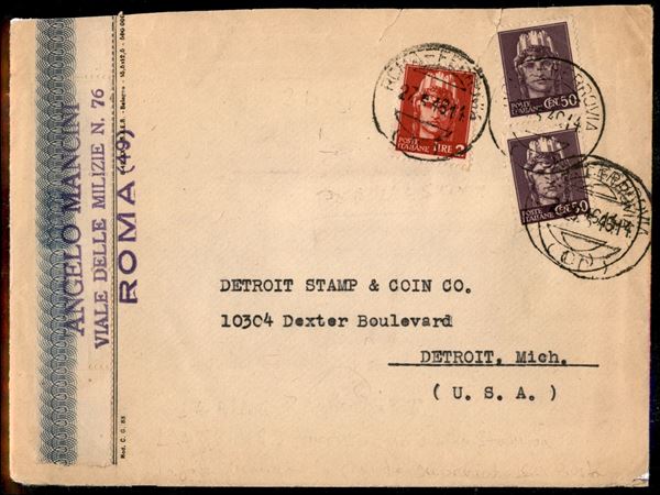 1946 - Stampe per l'estero affrancate con due 50 cent + 2 lire Turrita (538 + 541) da Roma 27.5.46 per Detroit - rara
