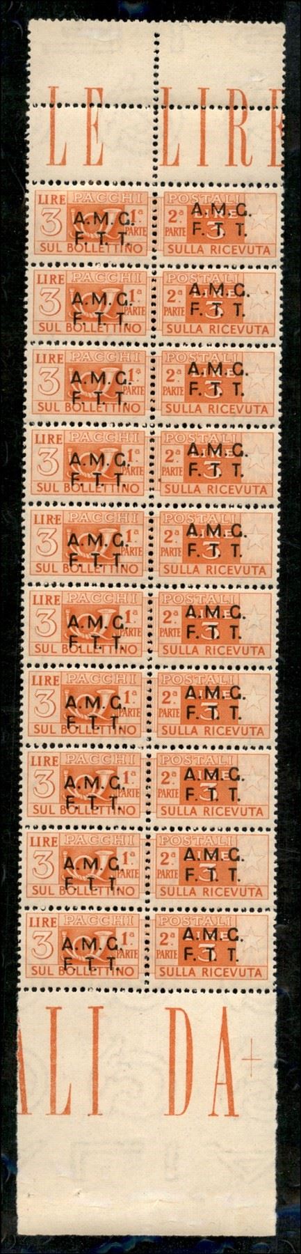 1947 - 3 lire Pacchi Postali (3) - blocco verticale di 10 centrale del foglio con soprastampe disallineate - gomma integra