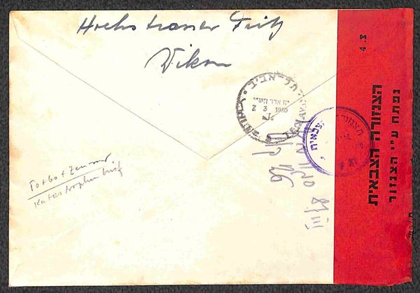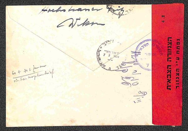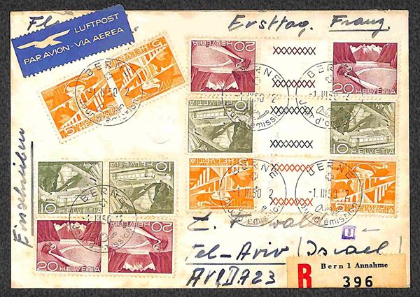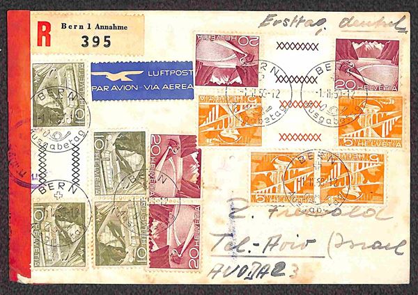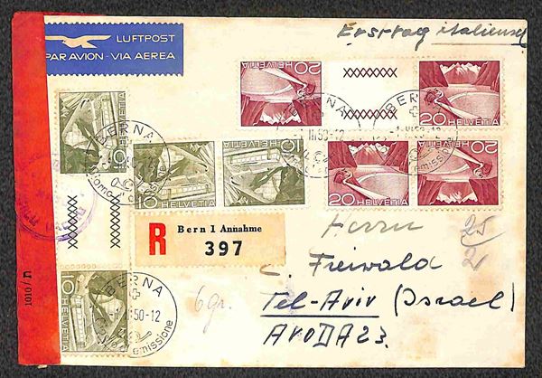 1950 - Tre lettere via aerea affrancate con Tecnica e Paesaggi tutte con accoppiamenti spazio vuoto con 2 linee a zig zag orizzontali - due con censure - tutte dirette a Tel Aviv
