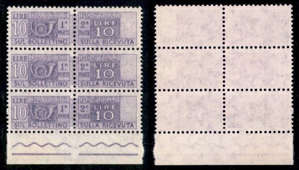 1955 - 10 lire Pacchi Postali (85/Ib) - blocco verticale di 3 con stampa evanescente - gomma integra - Cert. AG