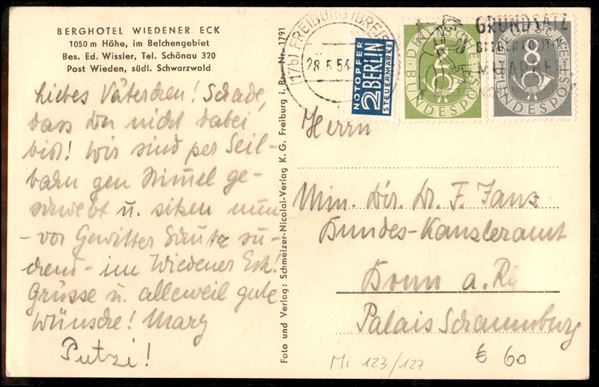 2 pfenning + 2 + 8 pfenning (2 + 123 + 127) - cartolina Freiburg 28.5.54