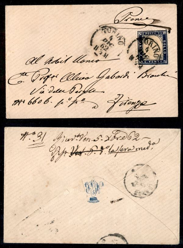20 cent (2) non dentellato in basso (pos. 46) - bustina da Torino a Firenze del 4.12.62